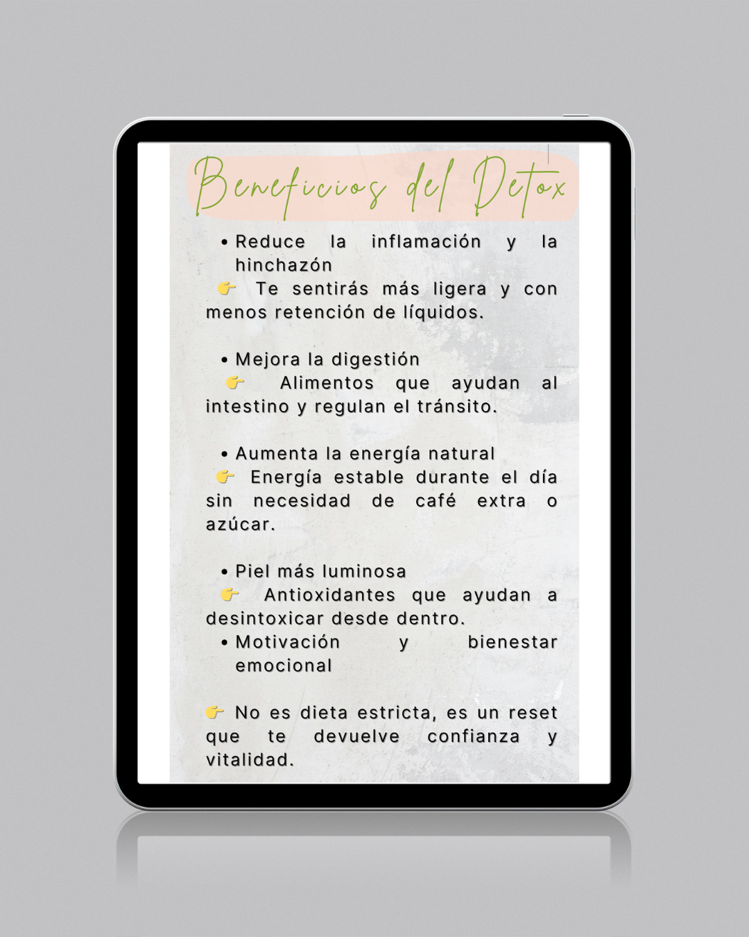 Es un plan en formato PDF con menús completos, recetas, lista de compras y explicaciones paso a paso para ayudarte a desinflamarte y sentirte más ligera en solo 3 dÃas.